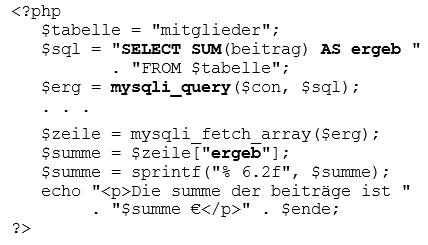 In der SELECT-anweisung können funktionen verwendet werden, mit denen für eine spalte mit numerischem inhalt der durchschnitt, die summe, das maximum oder das minimum aller zeilen einer DB-tabelle oder der zeilen, die eine bedingung erfüllen, ermittelt wird. Im übrigen ist alles wie bei der funktion COUNT.