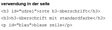 | h3#udrei | { color: red; } | #blau | { color: blue; } |