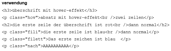 | .fili:first-line | { color: blue; } | die erste zeile des elements mit der klasse fili ist blau |