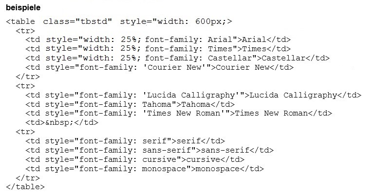 | monospace | nicht proportional | z.b. Courier, Courier New |