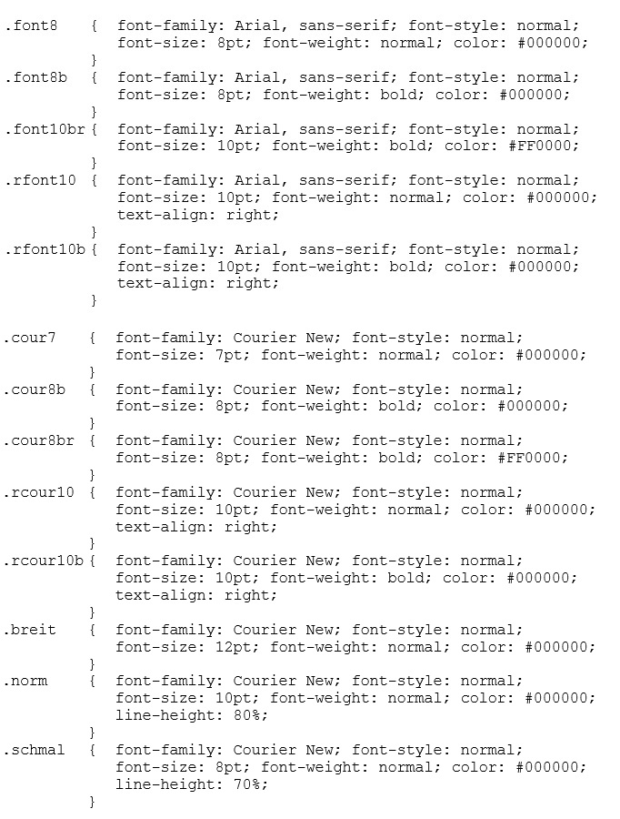 | cour | Courier New bold | n steht für: 8pt, 10pt, 11pt, 12pt, 16pt, 22pt |