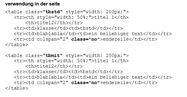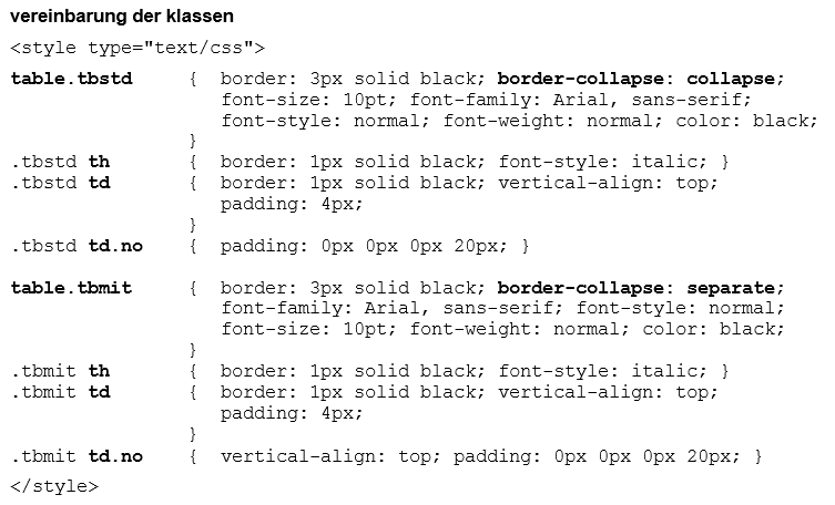 Die vorstehenden beispiele zeigen, dass die gestaltung einer tabelle recht schreibaufwendig sein kann. Wenn man einen bestimmten tabellentyp auf einer seite oder in einer anwendung mehrfach benötigt, wird man die definition der tabelle wohl besser in den header der seite oder eine eingebundene datei verlegen (1.3.2 – embedded styles, 1.3.3 – externe styles). In beiden fällen benötigt man dann nachfolge-selektoren (2.5).
