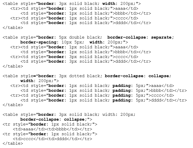 | border-collapse: collapse; | die rahmen der tabellenelemente werden ohne abstand zum rahmen der tabelle und zum rahmen der benachbarten tabellenelemente gezeichnet |