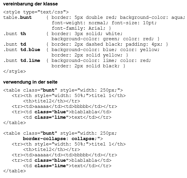 Das nächste beispiel treibt es etwas bunt; das besondere dabei ist, dass in der vereinbarung der klasse bunt die angabe border-collapse fehlt. Beim der zweiten tabelle wird das einfach nachgeliefert.