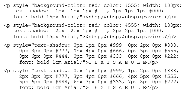 Die vier angaben für einen schatten kann man, durch komma getrennt, beliebig oft wiederholen, um damit besondere effekte zu erzielen. Es erfordert meist einige geduld und viele versuche, bis das ergebnis so aussieht, wie bei den nächsten vier beispielen.