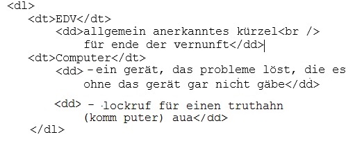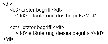 Darunter versteht man eine liste, bei der jeweils einem begriff eine erläuterung folgt (glossar). Zur definition benötigt man das dl-tag und eine oder mehrere folgen des dt- und dd-tags.