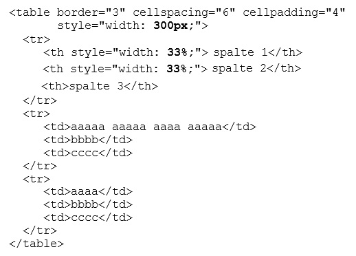 | <td style="width: nn%;"> | spaltenbreite in nn prozent der tabellenbreite |
