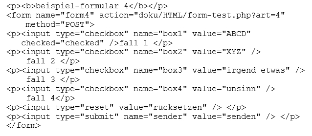 Mit dieser form des input-tags wird eine checkbox erzeugt; das tag hat kein ende-tag und kann beliebig oft in einem formular vorkommen. Eine checkbox wird durch anklicken ausgewählt bzw. die auswahl wird dadurch zurückgenommen. Enthält ein formular mehrere checkboxen, können mehr als eine ausgewählt werden.