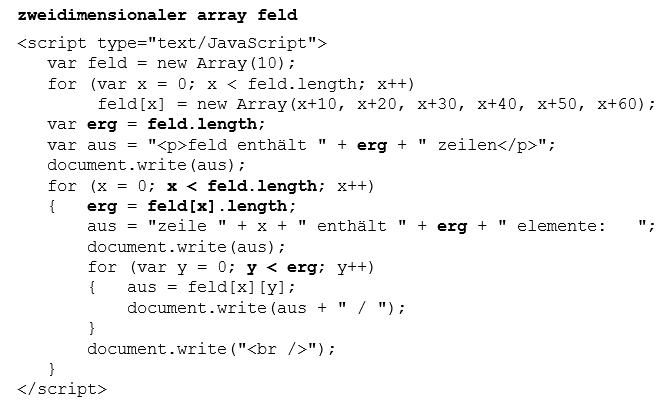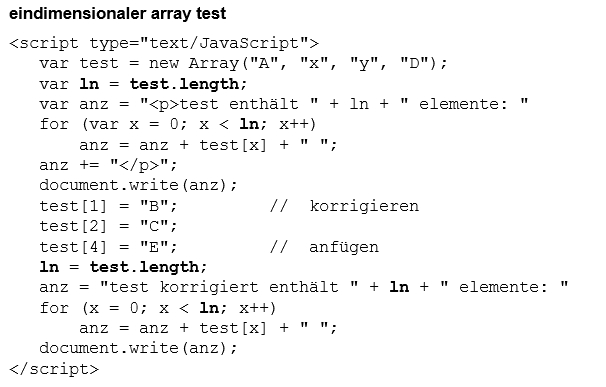 | [var ] name = new Array(wert, wert, . . .); | vollständige schreibweise |