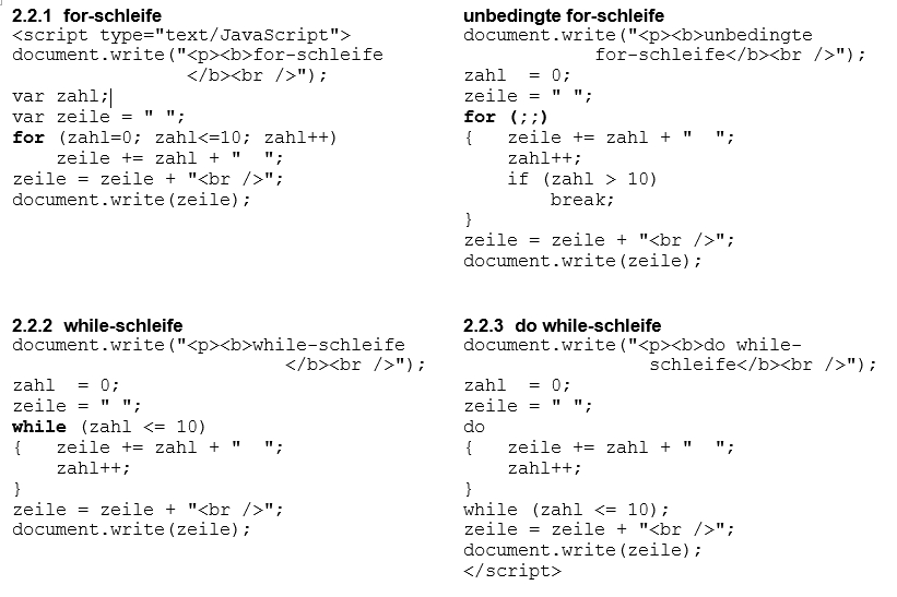 Der formalismus der programmschleifen gleicht weitgehend dem formalismus von C oder PHP und wird daher hier ohne weitere erklärungen an hand von beispielen gezeigt. Die verwendete methode document.write wird in kapitel 3.4 beschrieben..