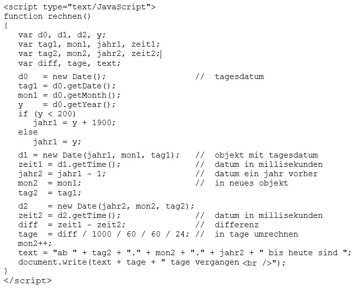 Die funktion rechnen erzeugt die instanz d0 mit dem aktuellen datum und holt daraus jahr, monat und tag. Damit wird die instanz d1 erzeugt und daraus (mit getTime) der zeitwert in millisekunden ermittelt (zeit1). Das aktuelle jahr wird um 1 vermindert und damit, sowie mit monat und tag die instanz d2 erzeugt, aus der ebenfalls der zeitwert (zeit2) ermittelt wird. Aus der differenz der beiden zeitwerte wird die anzahl der tage errechnet. Man darf für die errechnung des zeitwertes zeit1 nicht die instanz d0 verwenden, denn da steckt nicht nur das datum, sondern auch die uhrzeit drin, während d2 nur ein datum enthält. Das ergebnis wäre nicht grundfalsch, es würde halt keine gerade zahl von tagen heraus kommen, sondern eine zahl mit vielen stellen hinter dem komma.