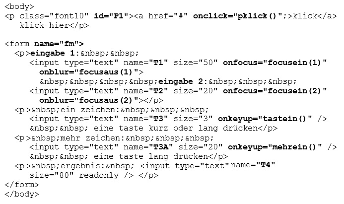 Es gibt eine einfache und weit verbreitete methode, funktionen für eventhandler zur verfügung zu stellen: man ordnet einem objekt der seite einen oder auch mehrere eventhandler zu und weist jeweils eine bestimmte funktion zu. Wenn man beispielsweise einem formular-element den eventhandler onfocus zuordnet, wird die zugewiesene funktion ausgeführt, wenn das element den focus erhält.