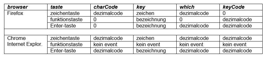 Die eigenschaften which, charCode, keyCode, key liefern browserabhängig