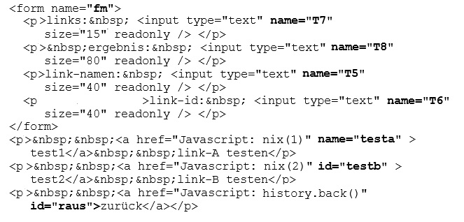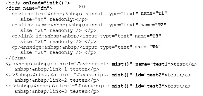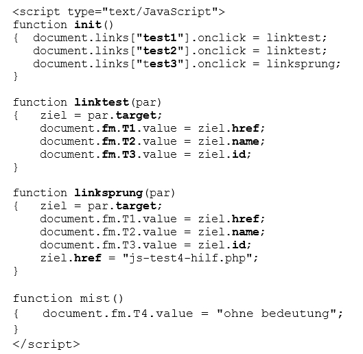 Beim laden der seite wird die funktion init aufgerufen, mit der für drei links der eventhandler onclick mit funktionen vereinbart wird. Man beachte, dass ein link einen namen hat und die beiden anderen eine id haben. Das ziel der links ist die funktion mist, die zwar nach der event-funktion ausgeführt wird, aber nichts weiter tut als einen bedeutungslosen text auszugeben.