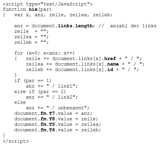 Die funktion nix ermittelt die anzahl der vorhandenen links und zeigt dies an. Dann zeigt sie, auf was die links verweisen und den namen bzw. die id der links. Bei der anzahl der links wird noch angezeigt, von welchem link die funktion aufgerufen wurde.