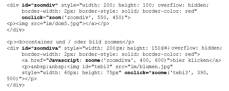 Der zweite fall in diesem beispiel ist kurios: ein zoombarer container enthält eine grafik, die ebenfalls gezoomt werden kann, wobei das zoomen für container und grafik jeweils durch einen aufruf der funktion zoome erfolgt. Man kann allerdings beim container den aufruf der funktion nicht mit onclick auslösen, weil dann ein click auf die grafik ebenfalls das zoomen des containers bewirkte. Also wurde hier ein link (hier klicken) eingebaut. Das spiel funktioniert auch, wenn man für ein element die funktion zoom und für das andere zoome verwendet. Für beide kann man zoom nicht verwenden, weil dann ein klick auf ein element immer das verkleinern des anderen auslöst.
