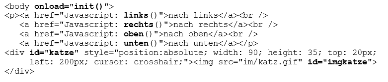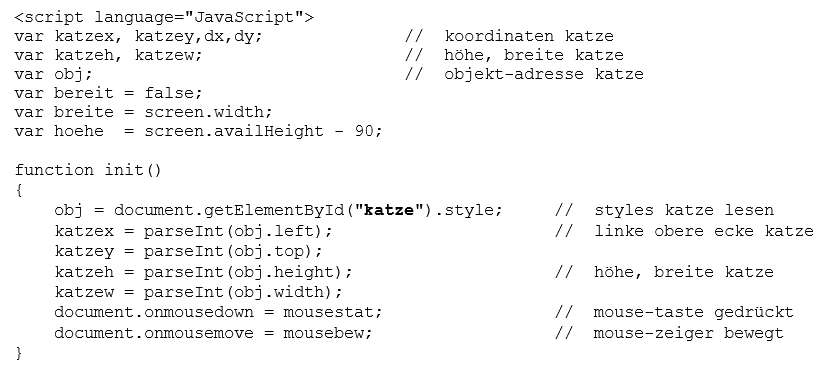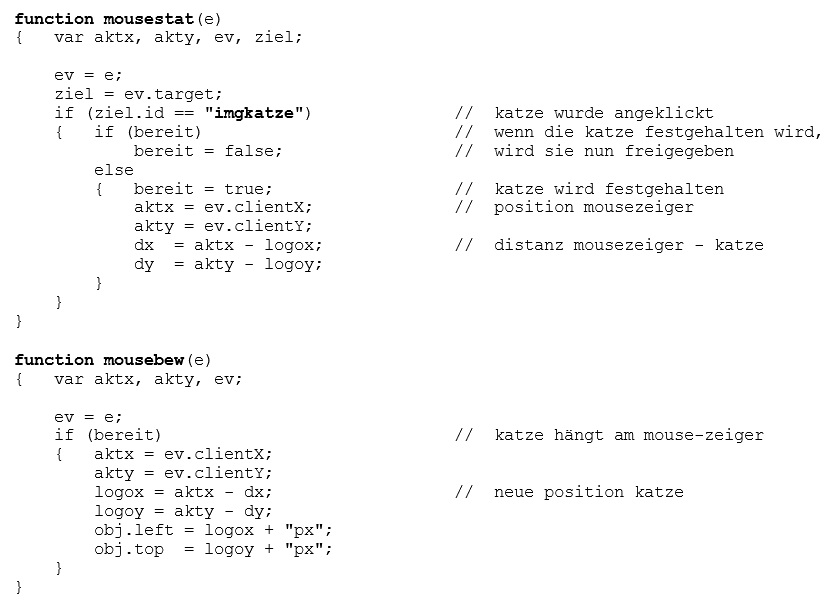 Die funktion mousestat reagiert nur, wenn sich beim klicken der mauszeiger über der katze (grafik imgkatze) befindet. Wenn die variable bereit den inhalt true hat, wird die katze schon festgehalten, die variable wird auf false gesetzt und die katze wird losgelassen. Andernfalls wird die variable auf true gesetzt und die distanz zwischen der maus-position und der linken, oberen ecke des containers wird errechnet. Von jetzt an folgt die katze dem mauszeiger.