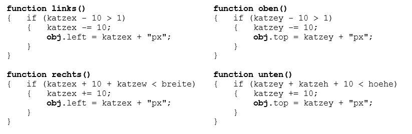 Mit den folgenden funktionen wird die katze schrittweise (10 pixel) bewegt.