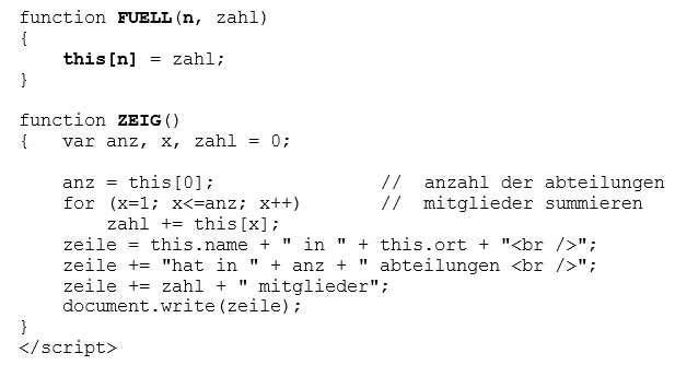 Die methode FUELL trägt für eine abteilung die anzahl der mitglieder in den unbenannten array ein. Die methode ZEIG summiert die anzahl der mitglieder aller abteilungen und zeigt sie an.