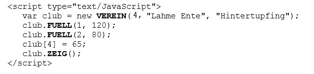 Es wird die instanz club des objekts VEREIN angelegt. Dann wird für die abteilungen 1 und 2 mit der methode FUELL die zahl der mitglieder eingetragen. Für die abteilung 4 wird die zahl der mitglieder direkt eingetragen, die schreibweise club[4] ist verwirrend, es sieht so aus als sei club ein array, ist es natürlich nicht, aber hinter dieser bezeichnung verbirgt sich der unbenannter array, der so angesprochen wird. In der abteilung 3 gibt es keine mitglieder. Zuletzt erfolgt mit der methode ZEIG die anzeige.