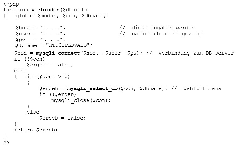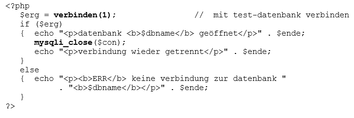 Die aufgerufene seite enthält eine funktion, mit der die verbindung zu einem server hergestellt wird und, abhängig von dem parameter $dbnr, eine datenbank gewählt wird. Die variablen $con mit dem handle der verbindung und $dbname mit dem namen der datenbank sind global, damit sie auf der seite auch außerhalb der funktion verwendet werden können. Diese funktion wird in allen weiteren beispielen verwendet. Der aufruf wird meist nicht gezeigt.
