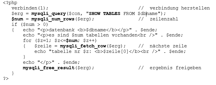 Die funktion query liefert als ergebnis die namen aller DB-tabellen einer datenbank oder false, wenn auf die datenbank nicht zugegriffen werden kann. Wenn keine tabellen vorhanden sind, ist das ergebnis true! Man muss beachten, dass das ergebnis in jeder zeile nur den namen einer tabelle enthält, trotzdem ist jede zeile ein feld (array) und der name steht im ersten element des feldes. Vor der auswertung sollte man mit der funktion num_rows die anzahl der ergebnis-zeilen feststellen und dann die zeilen der reihe nach mit der funktion fetch_row lesen.