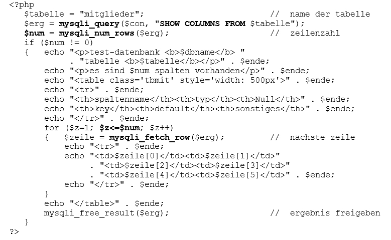 Die funktion query liefert als ergebnis für jede spalte einer DB-tabelle eine zeile oder false, wenn die tabelle nicht vorhanden ist. Jede ergebniszeile ist ein feld (array) mit sechs elementen (numerische indices !). Vor der auswertung sollte man mit der funktion num_rows die anzahl der ergebniszeilen feststellen und dann die zeilen mit der funktion fetch_row lesen und auswerten.