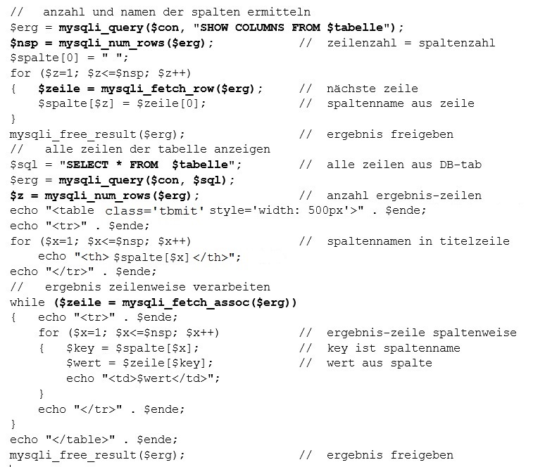 Der inhalt der DB-tabelle wird hier mit einer etwas komplizierteren routine angezeigt als bei kapitel 5.1. Gezeigt wird, wie man verfährt, wenn die anzahl und der name der spalten nicht bekannt ist.
