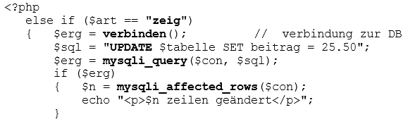 Die routine wird schrittweise erklärt: zunächst wird die verbindung zur datenbank hergestellt. Dann wird in allen zeilen die spalte beitrag geändert; die anzahl der geänderten zeilen wird ermittelt und angezeigt.