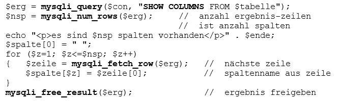 Bei der anzeige der DB-tabelle mit allen vorhandenen spalten wird gezeigt, wie das möglich ist, ohne zu wissen, wieviel spalten vorhanden sind und welche namen die spalten haben. Es werden also zunächst die anzahl der spalten je zeile und die namen der spalten ermittelt. Dazu muss man wissen, dass SHOW COLUMNS für jede spalte als ergebniszeile ein feld liefert, bei dem im ersten element der name der spalte steht. Die namen werden in dem feld $spalte gespeichert, die anzahl in der variablen $nsp. Das ergebnis wird freigegeben.