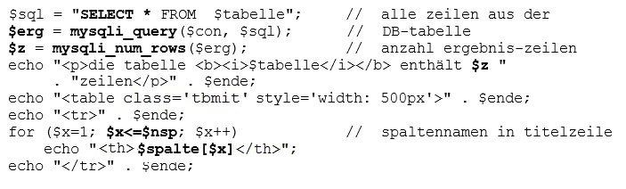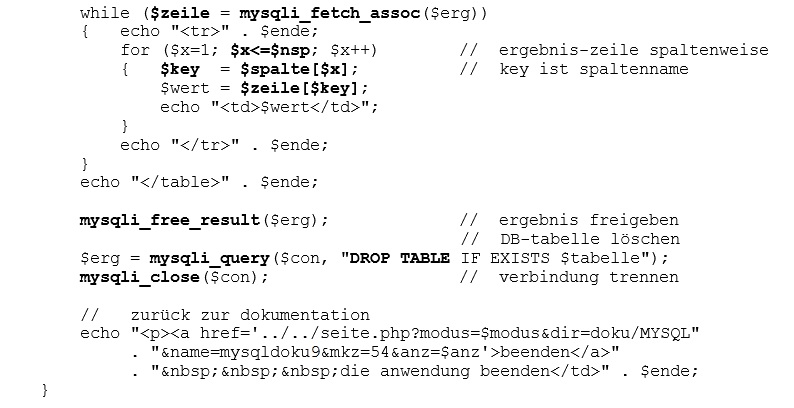 Jetzt wird endlich das ergebnis aus $erg zeilenweise nach $zeile gelesen; das ist keine einfache variable sondern ein assoziatives feld. Damit man das feld auswerten kann, braucht man als key die spaltennamen der DB-tabelle. Die namen stehen im feld $spalte, die anzahl der spalten in $nsp. Zuletzt wird das ergebnis freigegeben, die DB-tabelle wird gelöscht und die verbindung getrennt. Dann erfolgt die rückkehr zur dokumentation