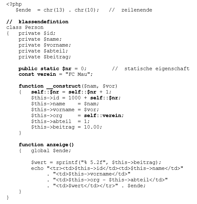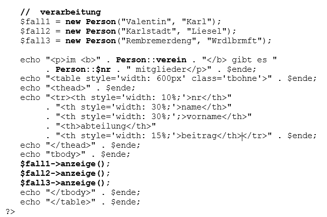 In der PHP-routine werden drei objekte erzeugt und angezeigt; dazu wird die methode anzeige verwendet, mit der die anzeige etwas aufwendiger gestaltet wird. Die klassenkonstante und die statische eigenschaft werden auch außerhalb der klassenmethoden verwendet.