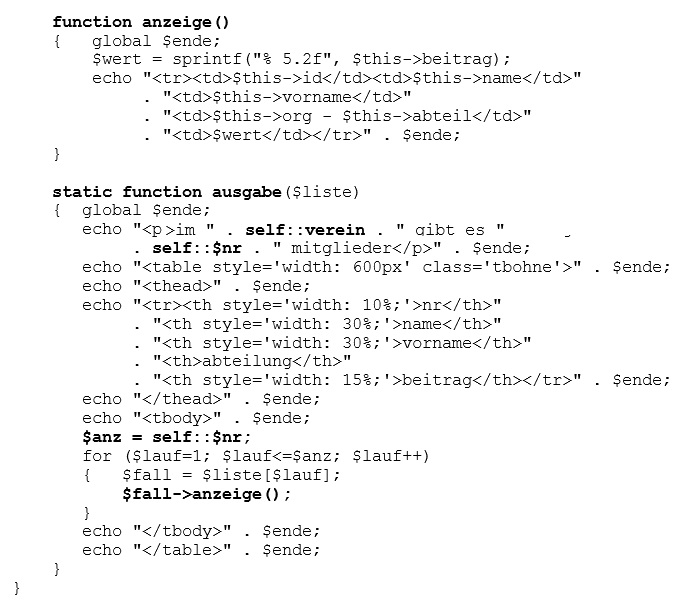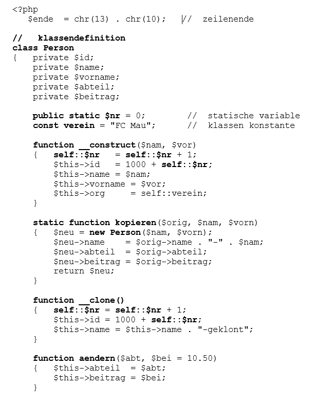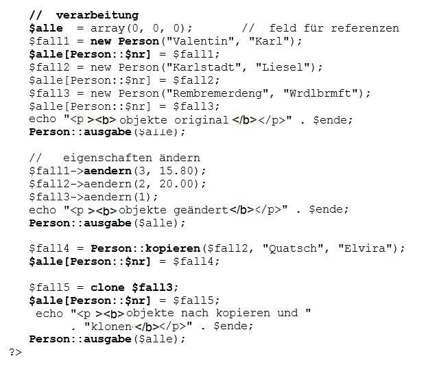 Bei der verarbeitung werden zunächst drei objekte erzeugt und ihre referenzen im feld $alle gespeichert. Bemerkenswert ist die indizierung mit hilfe der statischen variablen $alle[Person::$nr] die variable enthält nach dem erzeugen eines objekts die laufende nummer des objekts. Mit der methode ändern werden an den eigenschaften der objekte änderungen vorgenommen. Schließlich wird mit der methode kopieren das objekt $fall2 in das neue objekt $fall4 kopiert und dort etwas abgeändert. Zuletzt wird das objekt $fall3 als $fall5 geklont.