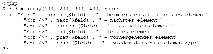 | $wert = current($feld) | liefert das aktuelle element,
