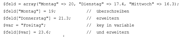Auch ein assoziatives feld kann man durch angabe einzelner elemente erweitern, ändern oder ganz neu anlegen. Das schlüsselwort kann dabei auch in einer variablen stehen.