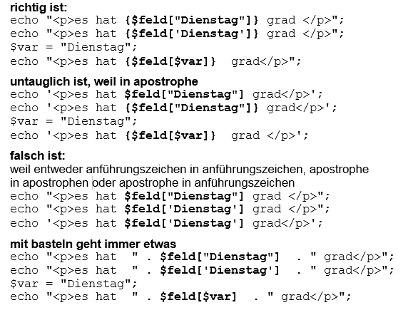 Probleme gibt es, wenn mit einer echo-anweisung eine HTML-anweisung erzeugt wird und dabei ein feld-element benötigt wird, denn diese anweisung muss in apostrophe oder anführungszeichen eingeschlossen werden. Aber apostrophe taugen nicht, denn dann wird bekanntlich nicht der inhalt sondern der name des elements ausgegeben. Anführungszeichen aber führen zu einem fehler, es sei denn, die angabe des elements ist in geschweifte klammern eingeschlossen. Das gilt auch, wenn als key eine variable angegeben ist. Aus dem gesagten ergibt sich: