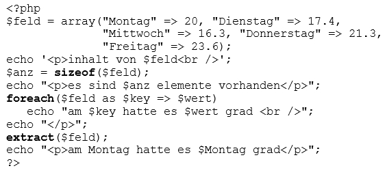 | extract($feld); | liefert variable mit den namen der key und dem inhalt des damit assoziierten feldeelements. |