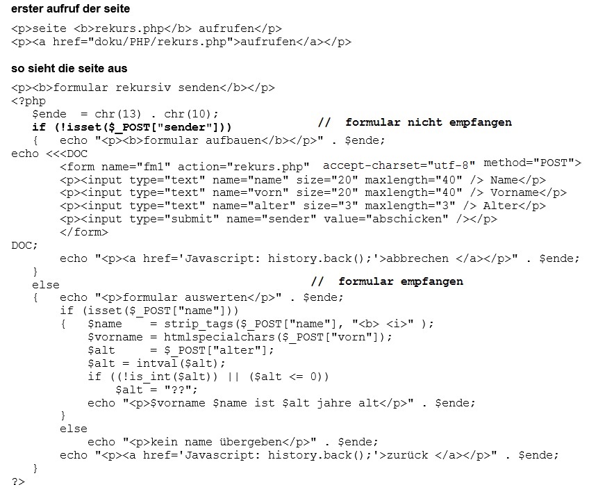 Damit ist gemeint, dass eine seite ein formular aufbaut und dann an sich selbst schickt, d.h. sich selbst aufruft und dabei das formular übergibt. Das bedeutet, beim aufruf der seite muss geprüft werden, ob der aufruf mit oder ohne formular erfolgte; im einen fall kann das formular ausgewertet werden, im andern fall muss das formular aufgebaut werden. Da ein formular in der regel ein submit-element enthält, gibt man dem element einen namen und prüft in der aufgerufenen seite, ob im feld $_POST oder $_GET das element vorhanden ist. Natürlich kann man auch einen parameter übergeben, der anzeigt, ob der aufruf mit oder ohne formular erfolg ist. Das bisher behandelte beispiel wurd für rekursive formular-übergabe umgebaut.
