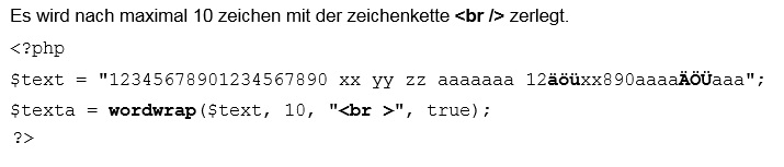 achtung Die funktion hat eine schwäche, wenn die zeichenkette im Unicode codiert ist und 2-byte-zeichen enthält (geschlossene umlaut, €, §, °, ², ³, µ siehe 8.9) wertet die funktion diese zeichen als zwei zeichen und zerreißt ggf. ein solches zeichen zu zwei nicht darstellbaren zeichen. Im Internet wurde die funktion wordwrap_utf8 gefunden, die mit diesen zeichen kein problem hat, ziemlich stur mit der angegebenen zeichenlänge zerlegt, dabe aber nicht immer ganz sauber zählt.