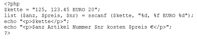 Nicht aufbereitet wurden die zeichenfolgen ", " und " EURO ", die zeichenfolgen "125", "123.45" und "20" wurden den variablen $anz, $preis und $nr zugewiesen.