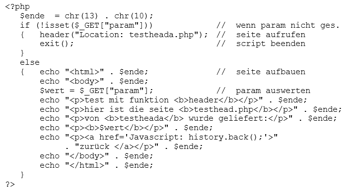 Mit dieser funktion wird der browser veranlaßt, eine andere seite aufzurufen, aber auf eine etwas merkwürdige art: die funktion muß aufgerufen werden bevor auf der aufgerufenen seite irgendetwas ausgegeben wird, das beispiel in testheader.php ist sehr genau zu beachten. Durch die funktion wird eine neue seite aufgerufen, aber das PHP-skript auf der aufrufenden seite wird weiter ausgeführt. Das ist meist nicht sinnvoll, d.h. man sollte nach dem aufruf das skript beenden.