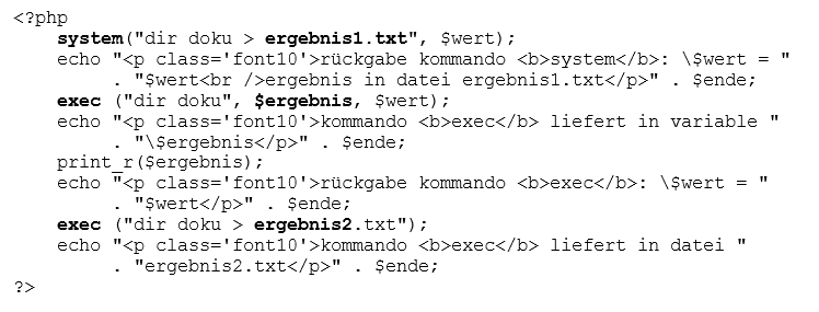 Die beiden folgenden funktionen führen ein systemkommando auf dem PC des anwenders aus; sie können auch dazu verwendet werden, ein programm zu starten. Wenn das im hintergrund läuft, müssen die ausgaben des programms in eine datei umgelenkt werden, weil sonst PHP hängt, bis das programm zu ende ist. Die ausgaben von systemkommandos sind meist nicht besonders gut geeignet, um direkt vom browser ausgegeben zu werden, d.h. man leitet sie am besten in eine datei um.